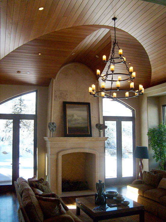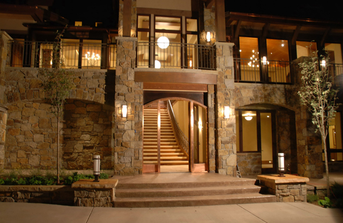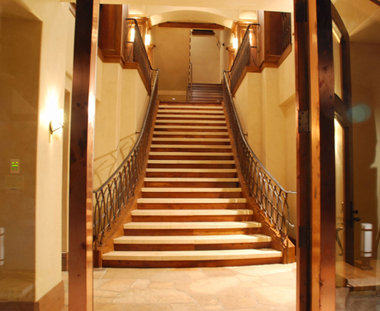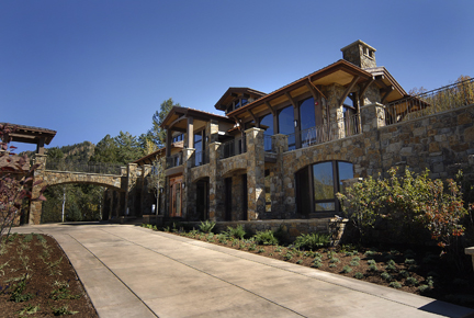 The architecture borrows from a medieval Italian hillside town as it climbs up the hill and stretches across the driveway. Stone, stucco and heavy timbers give the exterior a warm old world feel and blends it into the natural surroundings.