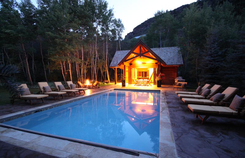 The pool and cabana are both completely new construction on a previously underutilized part of the property. This is the ultimate entertaining area complete with pool area, fire pit, covered dining area, large barbeque, extensive outdoor decks and for the rainy days enclosed pool cabana with wet bar and bathroom. The new pool and cabana are tucked into existing forest of mature aspen and spruce trees that provide both shelter and privacy.