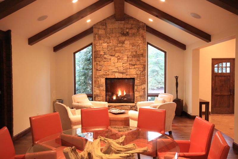 The living and dining room area of the main house have been expanded and a wet bar added to the dining area. A new media room was also created. The roof over living and dining was lifted up and simplified by having a center ridge beam that ties the whole area together. The higher roof also enables more light to enter the room by adding windows up high on the south side and nice tall windows on either side of new fireplace. By moving the fireplace to the center of the north wall were it lines up with the ridge and simplifying the space both living and dining areas are more coherent and functional. Large sliding glass wall opens the south side of the living and dining up to the back yard entertaining area.